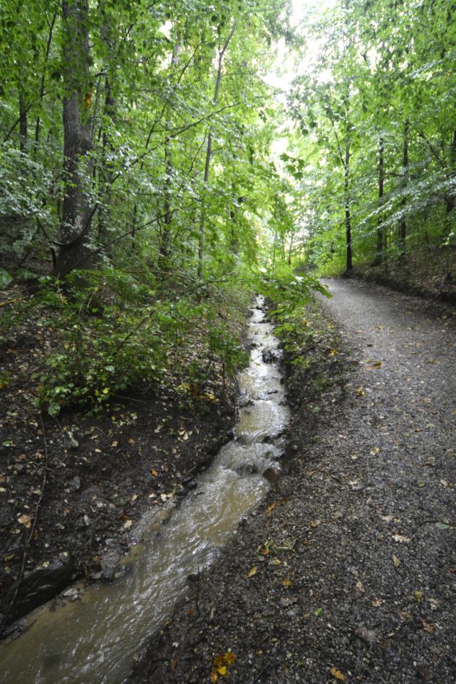 Vandløbet gennem skovslugten leder regnvand fra Kildebjerg-området, Skanderborgvej og området ved Ry Hallerne ud i Knudsø.